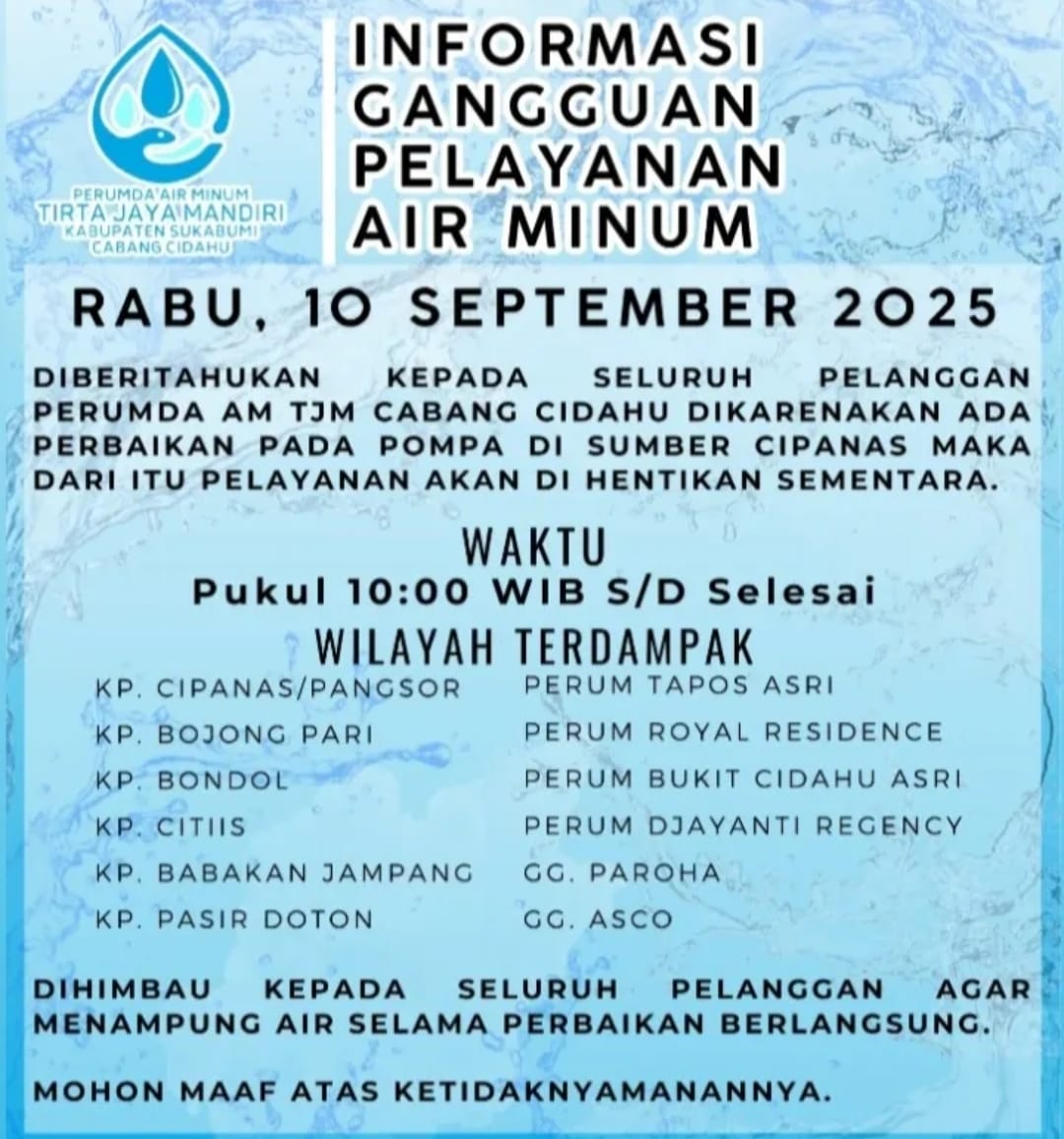 Perusahaan Umum Daerah Air Minum Tirta Jaya Mandiri (Perumda AM TJM) Kabupaten Sukabumi melalui Cabang Cidahu menyampaikan informasi adanya gangguan layanan distribusi air bersih pada Senin, 10 September 2025.