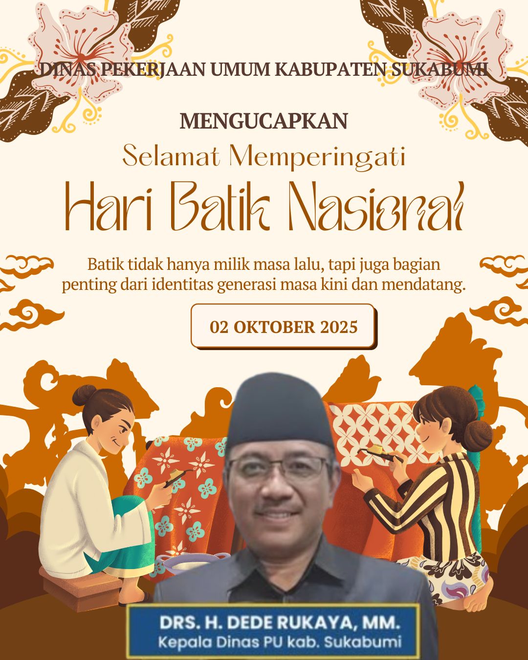 Dinas PU Kabupaten Sukabumi Mengucapkan Selamat Hari Batik Nasional 2025admin21/10/202521/10/2025News, Sukabumi25859 Views Post Views: 25,859 Don't MissDinas PU Kabupaten Sukabumi Mengucapkan Selamat Hari Santri Nasional 2025Dinas PU Kabupaten Sukabumi Fokus Tuntaskan Ruas Jalan Parungkuda–Bojongpari Tahun 2026Video Rieke Diah Pitaloka Soroti Jalan Rusak di Cikidang, Minta Perhatian Pemprov dan Pemkab Sukabumi SUKABUMI – Kondisi jalan rusak di wilayah Cikidang, Kabupaten Sukabumi, kembali menjadi sorotan publik setelah aktris sekaligus aUPTD PU Jampangkulon Fokus Tangani 10 Kilometer Jalan Kabupaten pada 2025Bendungan Leuwi Bangga Selesai Diperbaiki, Warga Tiga Desa Akhirnya Kembali Nikmati Air Bersih dan IrigasiH.M. Kamaludin Zen Resmi Nakhodai FORKI Kabupaten Sukabumi Periode 2025–2029