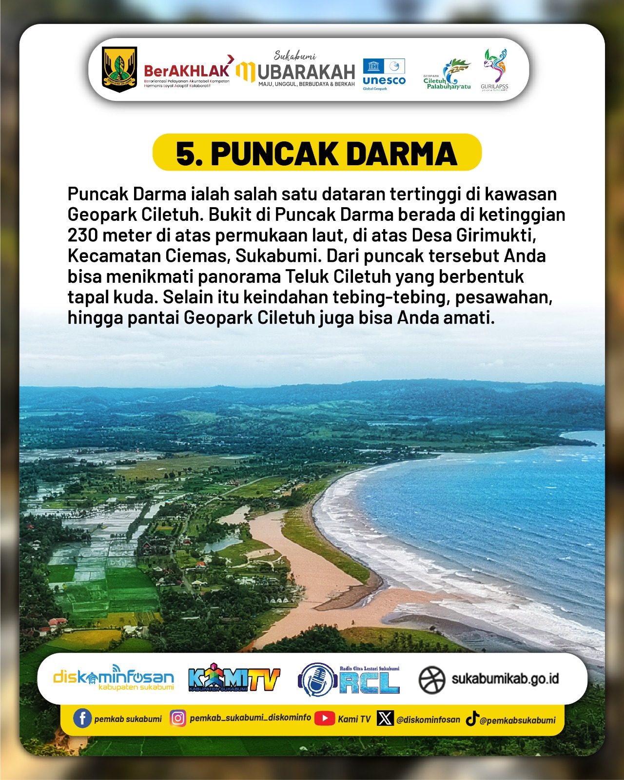 Dengan ketinggian mencapai ± 230 meter di atas permukaan laut, Puncak Darma menjadi salah satu spot terbaik untuk menikmati matahari terbit maupun terbenam. Dari titik ini, pengunjung dapat menyaksikan hamparan Teluk Ciletuh, garis pantai melengkung yang ikonik, serta gugusan perbukitan batuan purba yang menjadi ciri khas kawasan geopark.