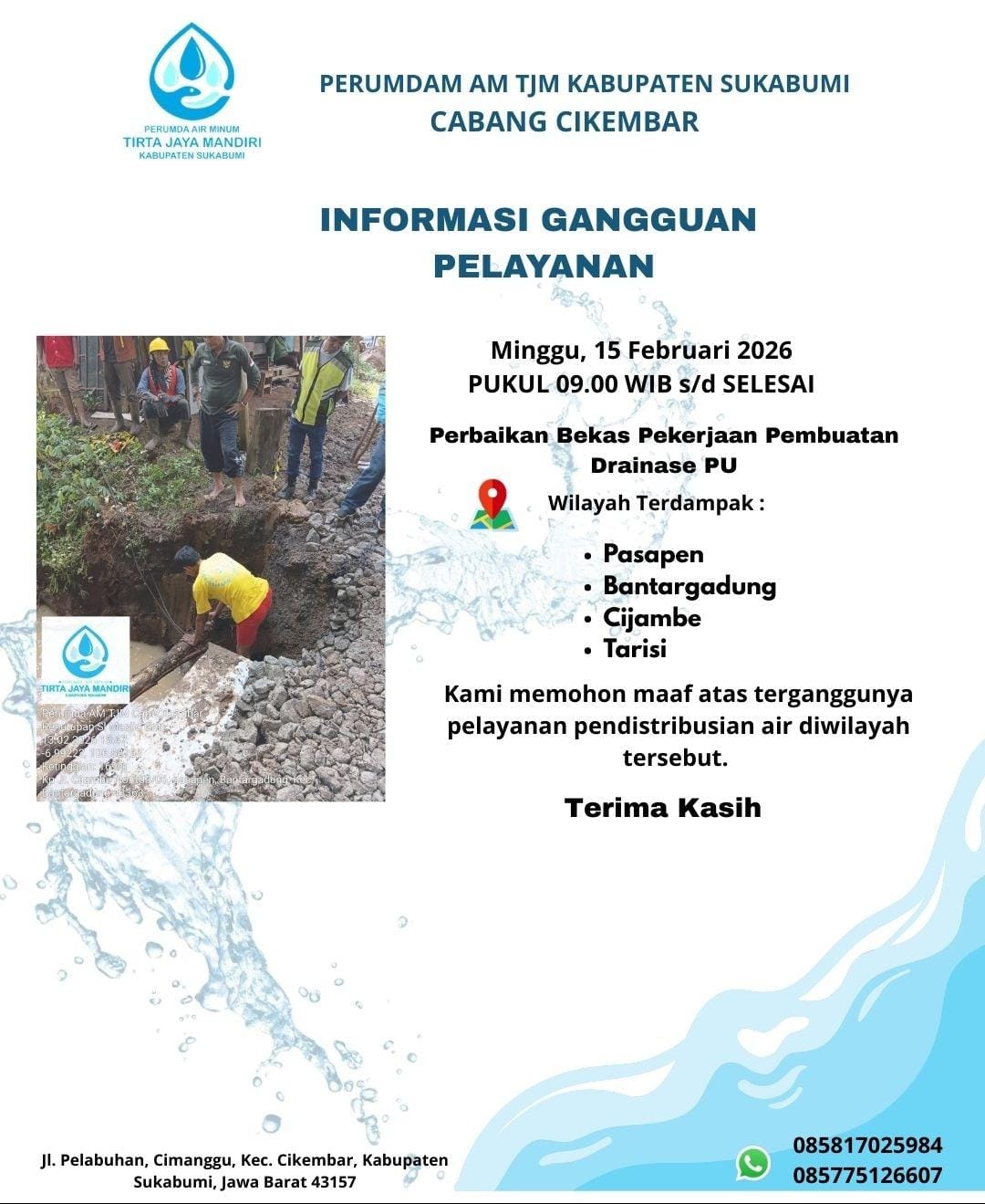 Manajemen PERUMDA AM TJM Kabupaten Sukabumi menyampaikan permohonan maaf atas ketidaknyamanan yang terjadi dan mengimbau kepada pelanggan di wilayah terdampak untuk melakukan penampungan air sebagai langkah antisipasi.